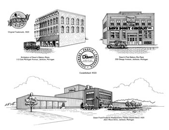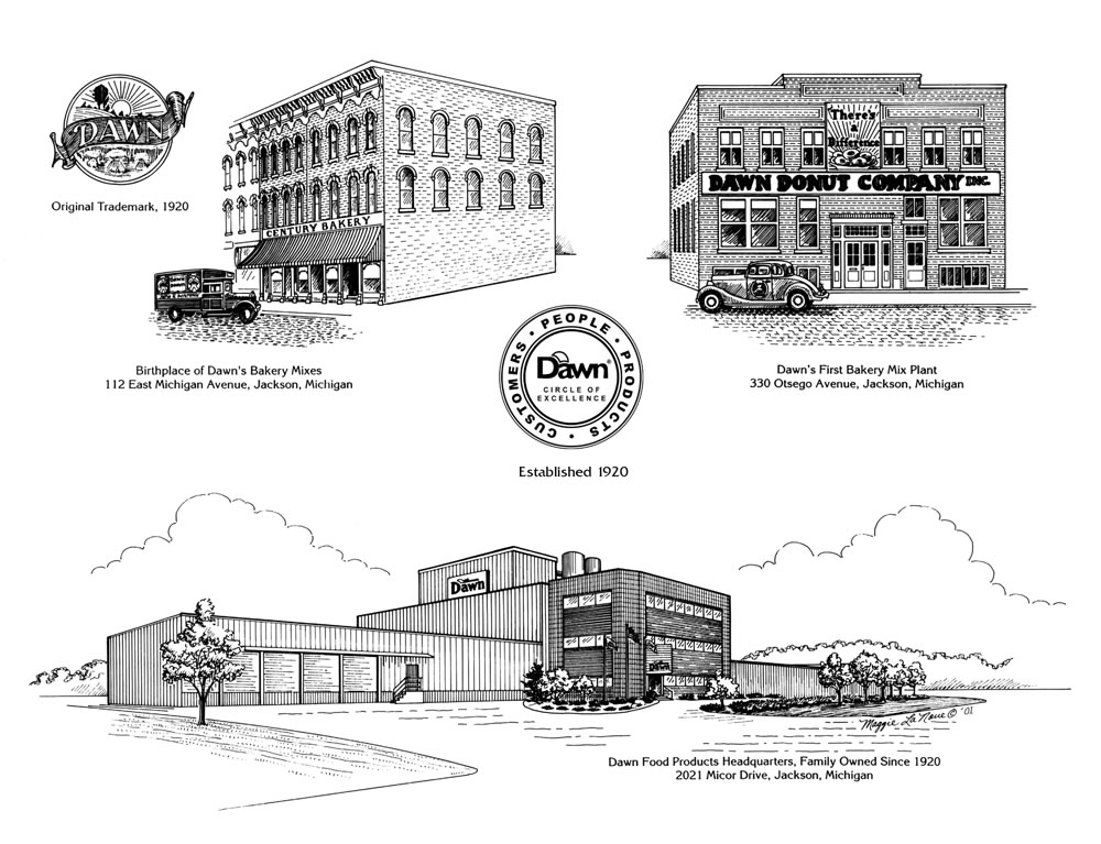 ![]() Later, Dawn Foods bought the old "Jacobson's" headquarters in Jackson Michigan. Interestingly, Maggie's art of Jacobson's - another Michigan centennial business - was already hanging in this building. The lobby of the new Dawn headquarter has a bench and lampposts representing the original fanciful views from Maggie's art. This was an example of reality following an artist's representation of an old fashioned family scene. The new Dawn logo now represents the sun, and is reflecting off of the lake next to the new Dawn headquarters. Maggie hired a small plane and flew over the headquarters to get the photos for this art that was adapted from all of the previous works of art and shows the amazing growth of this family business. Dawn is now one of (if not the) largest family owned business in the world. |