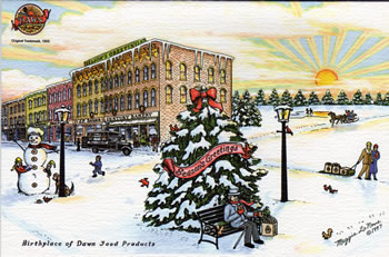 ![]() In this holiday card developed for Dawn Foods in 1996, we zoomed in on the original location of Dawn, and showed the delivery truck in greater detail. The old man is still on the bench, but it is next to the building now. The man and woman who happened to be waiting for a bus together earlier are now walking together, and it is still a cold and windy day, good for eating donuts. The old man on the bench now has a red tip to his cane, and his character represents one of the original founders who became blind in his later years. |
