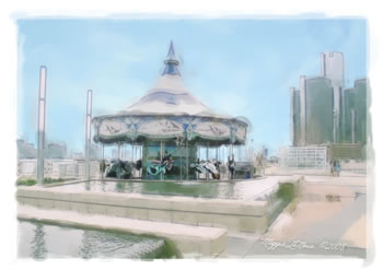 ![]() This art by Maggie LaNoue features a Detroit Riverfront landmark in Rivard Plaza, the Cullen Family Carousel. It features creatures native to the Detroit River, including sturgeon, egrets and walleye, along with the mythical River Mermaid and River Monster. The carousel opened in June 2007, and quickly became a favorite a Detroit destination for families visiting the Riverfront. |