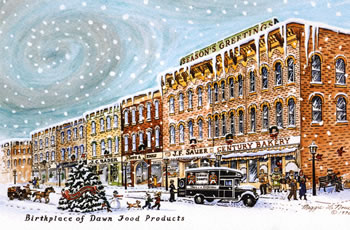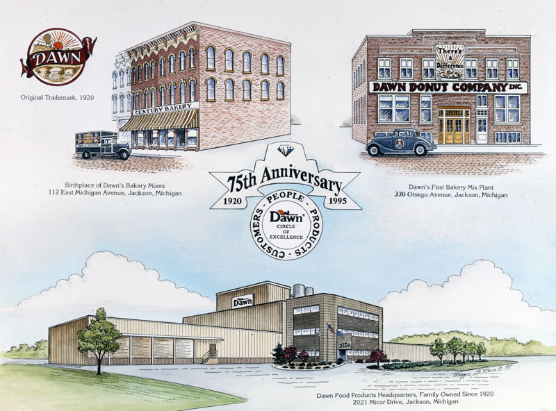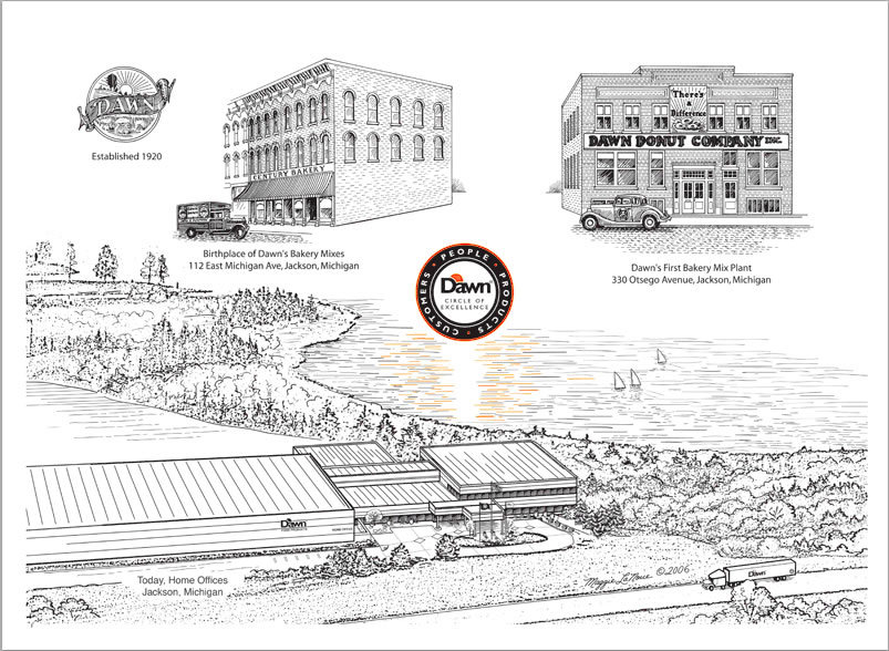 ![]() Later, Dawn Foods bought the old "Jacobson's" headquarters in Jackson Michigan. Interestingly, Maggie's art of Jacobson's - another Michigan centennial business - was already hanging in this building. The lobby of the new Dawn headquarter has a bench and lampposts representing the original fanciful views from Maggie's art. This was an example of reality following an artist's representation of an old fashioned family scene. The new Dawn logo now represents the sun, and is reflecting off of the lake next to the new Dawn headquarters. Maggie hired a small plane and flew over the headquarters to get the photos for this art that was adapted from all of the previous works of art and shows the amazing growth of this family business. Dawn is now one of (if not the) largest family owned business in the world. |