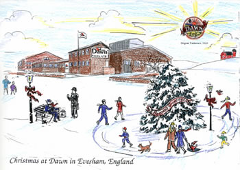 ![]() This is a scan of the sketch which was used for the planning of the cards we created for the following year. The venue changed to the Dawn plant in England, and there is a Bobby police officer sharing a donut with the old man on the bench. The couple has a new baby, and little brother is running behing the sled. The Dawn logo is in the sky, representing the sun. We used messages on the inside from many languages saying Season's Greetings, and these cards were sent to four continents. |