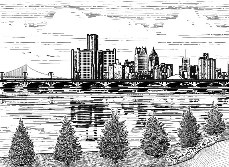 There are separate lanes for pedestrian and bike traffic. Each card of the series brought many comments from the recipients and became collector’s items. Framed prints of the original art are in the Detroit RiverFront Conservancy home offices in the Renaissance Center.