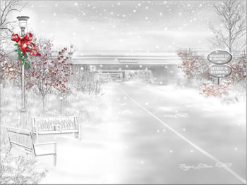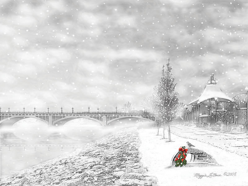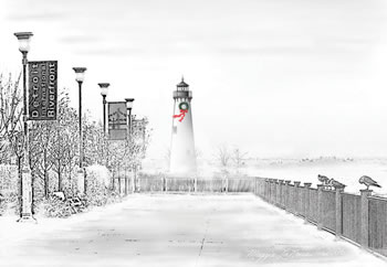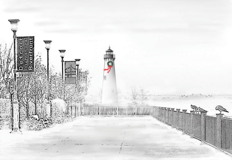 ![]() Above, the Milliken State Park and Harbor Lighthouse. William G. Milliken State Park and Harbor boasts a 63-foot lighthouse, which is a scaled down replica of the recently renovated lighthouse at Tawas Point State Park, originally built in 1876. Tawas Point Lighthouse is the sole representative of a true Victorian-era style station built on the Great Lakes. Maggie combined many photos with art, including the bench, Riverfront signs, lights, and birds huddling, and recreated them with hand painted touches in Photoshop, adding mist and wispy snow. This was the 2007 holiday card design for the Detroit RiverFront Conservancy. |